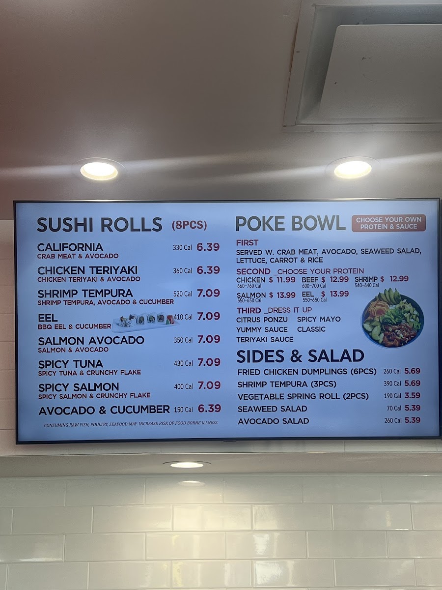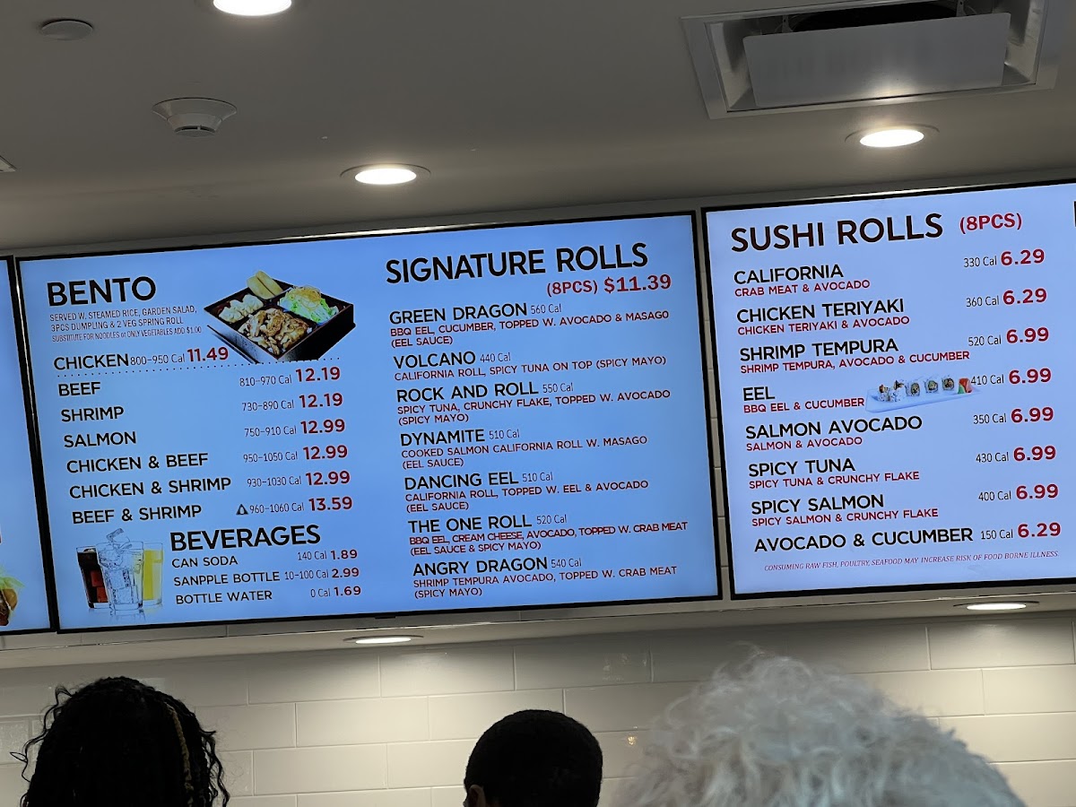 Cooked salmon, California roll with Masago (eel sauce). 510 cal.