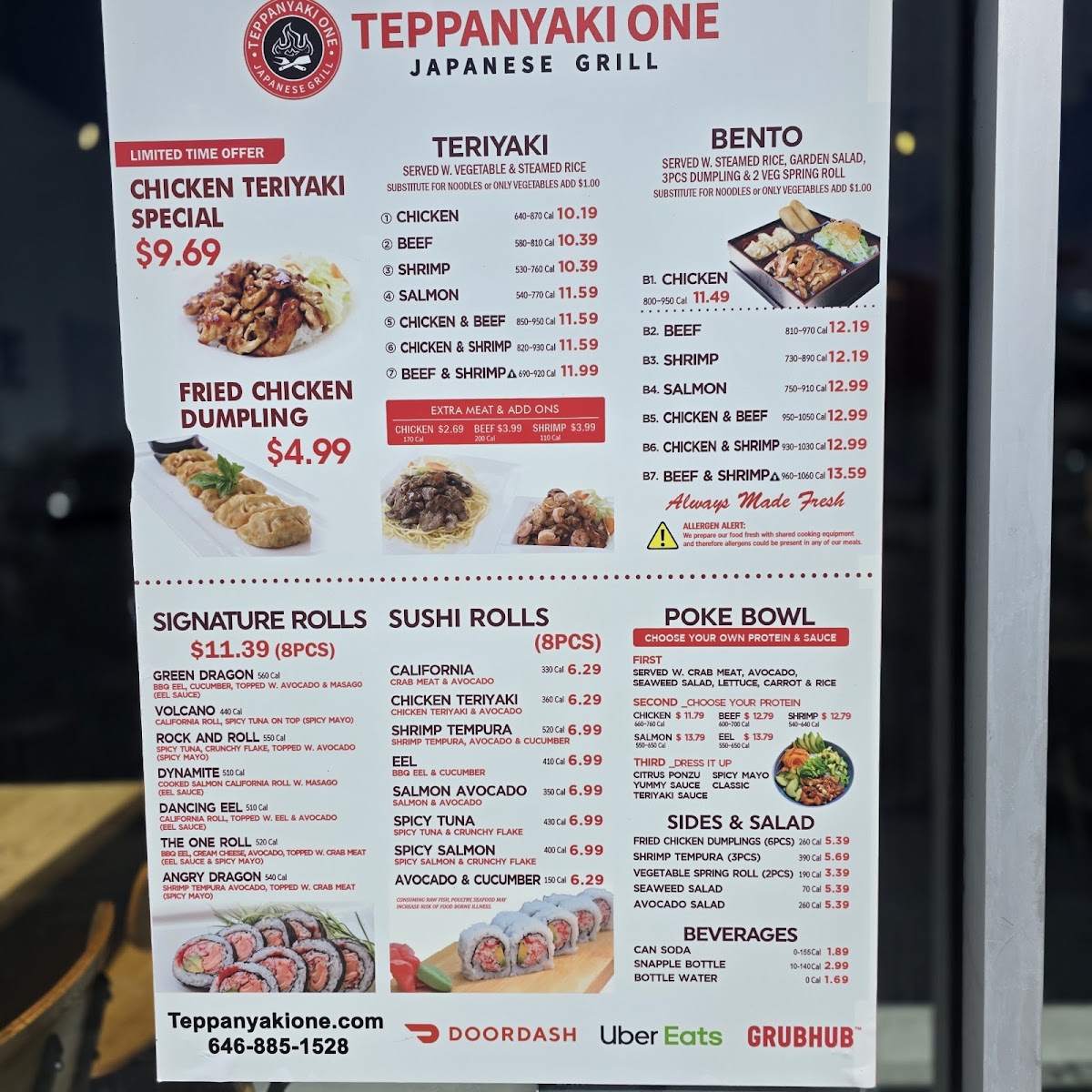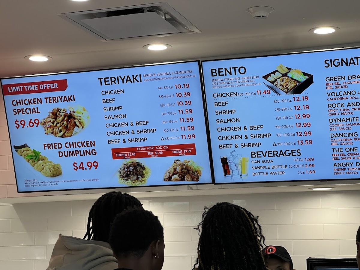 Served w. steamed rice, garden salad, 3pcs dumplings & 2pcs veg spring rolls 960-1060 cal.